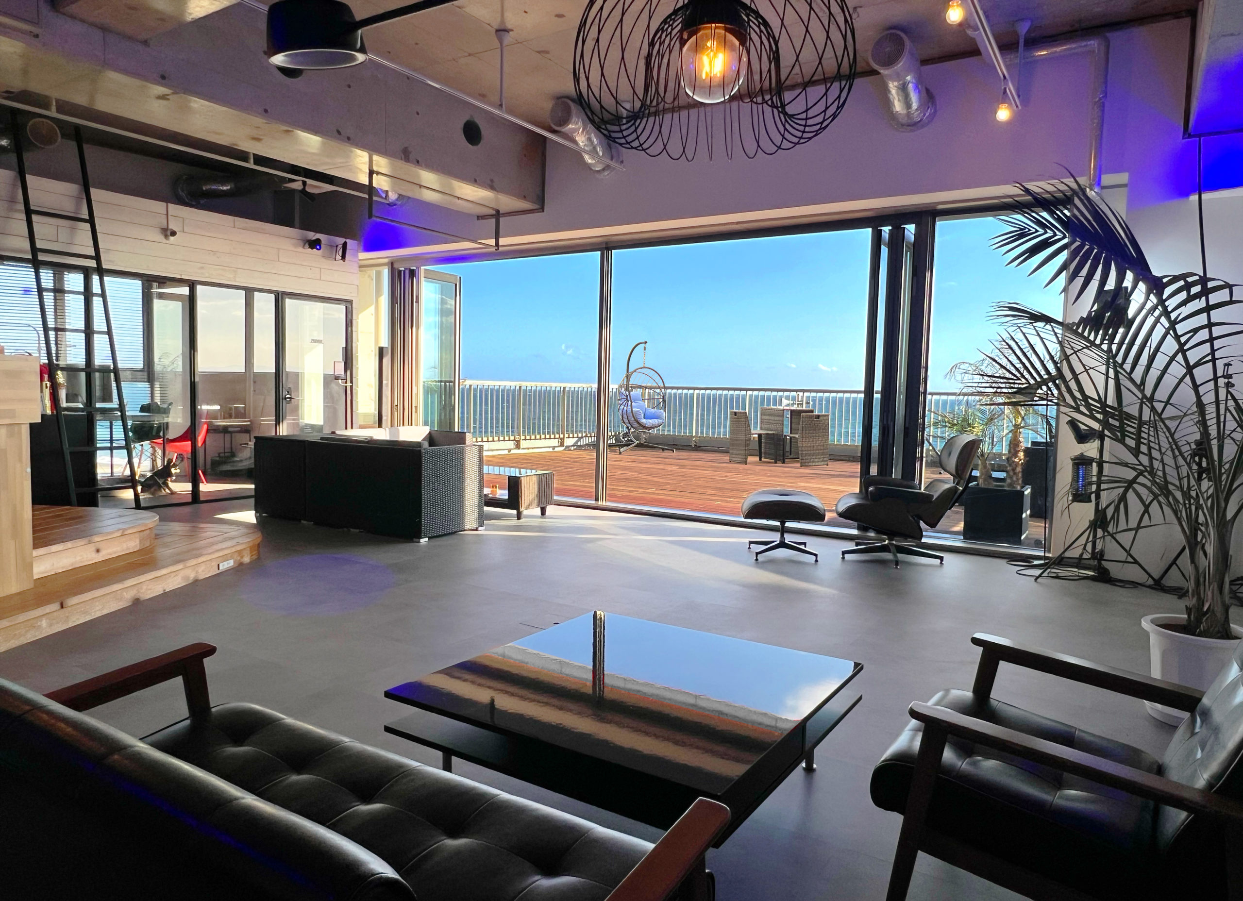 ルーフテラスはラグジュアリーなオーシャンビュー、夜は照明を自由に変更してナイトクラブ風。